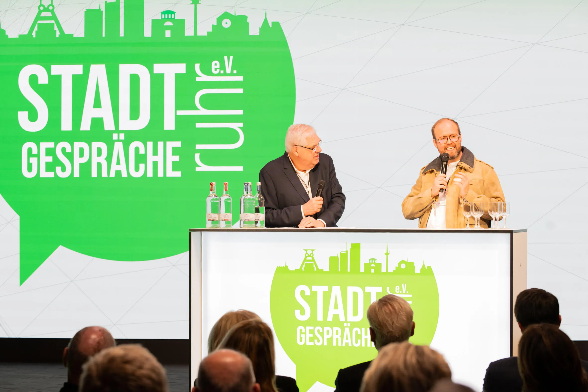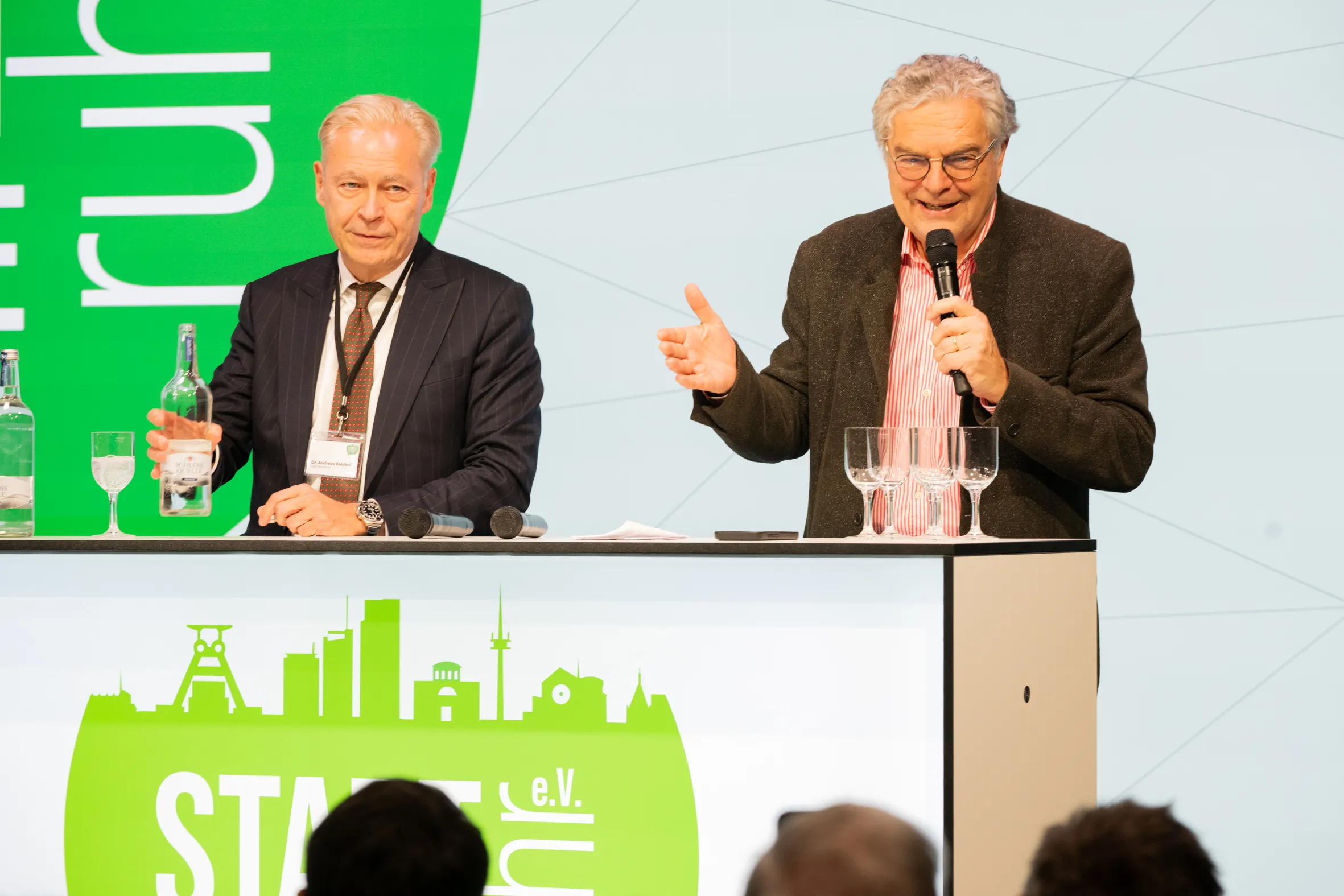 Einmal mehr zeigte sich, wie persönlich die STADTGESPRÄCHE geworden sind und wie sehr sich die Gäste inzwischen freuen, einander wiederzusehen: So erinnerte Ralf Kubbernuß, Chefredakteur der Neuen Ruhr/Neuen Rhein-Zeitung, im Namen der Funke Mediengruppe in seinem Grußwort daran, dass er einst vor vielen Jahren vom damaligen Chefredakteur Dr. Richard Kiessler, Gastgeber der STADTGESPRÄCHRE.ruhr, als Volontär eingestellt worden war und heute dessen Nach-Nach-Nachfolger im Amt ist. Was für eine steile Karriere! Kiessler, der in seiner Einführung in den Abend kurz das Unternehmen Steag Iqony – heute der größte Fernwärme-Versorger Deutschlands – vorstellte, warnte davor, wenn die Strompreise nicht sinken, der Ausbau der erneuerbaren Energie nicht pragmatisch weiter verfolgt würden, verliere unser Land weiter im internationalen Wettbewerb. In der Talkrunde, die Moderator Jürgen Zurheide gewohnt sachkundig und souverän anschließend mit Reichel, führte, wurde klar, dass wir uns in Deutschland in einer dramatischen Lage befinden: Reichel, einst Beisitzer im FDP-Bundesvorstand und für die Partei zehn Jahre MdL im NRW-Landtag, betonte, dass die Energiewende „keine Erfindung von grünen Spinnern“ sei, sondern ein internationaler Trend. „Wir haben die Chance, technologisch Vorreiter zu sein“, so der Talkgast. Die schwarz-rote Regierung habe einen beachtlichen Neustart hingelegt und die richtigen Schwerpunkte gesetzt. Aber es brauche Akzeptanz, um von der Förder- und Subventionsmentalität runter zu kommen.